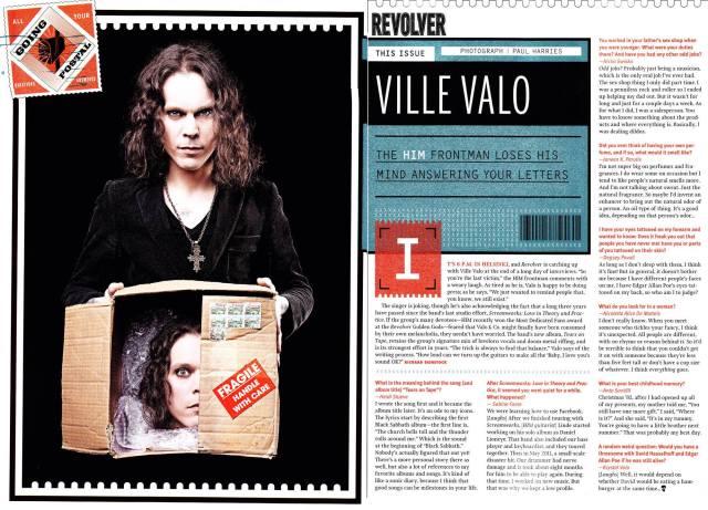 В Хельсинки 6 вечера, и Revolver нагнал Ville Valo в конце длинного дня, полного интервью. «Так вы – последняя жертва», - комментирует фронтмен HIM с усталым смехом. Насколько уставший, настолько и довольный общаться с прессой, Valo, как он говорит: «Мы лишь хотим напомнить людям, что мы, знаете ли, все еще существуем».